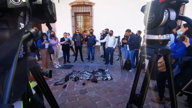 Zacatecas, Zac.- Congregados en la Plaza de Armas, periodistas zacatecanos se manifestaron por la violencia que sufren colegas en diversos puntos del país y por aquellos que han muerto asesinados en los últimos años, así como por la falta de apertura informativa por parte del Gobierno del Estado.