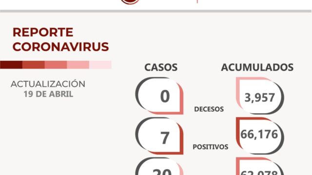Zacatecas, Zac..- Este martes, Zacatecas llega al sexto día consecutivo sin defunciones por Covid-19; además, registra 20 pacientes recuperados en las últimas 24 horas y siete nuevos casos, de acuerdo al reporte diario de la Secretaría de Salud del estado.
