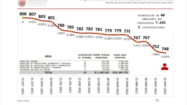 “En el último cuatrimestre en el Instituto se ha disminuido la plantilla laboral en un 7.4%, con 60 bajas de personal plenamente consensuadas con respeto a sus derechos para llegar a indemnizaciones correspondientes conforme a la Ley; al día de hoy somos 748 trabajadores, se ha logrado disminuir la plantilla laboral al nivel que se tenía en el año 2006, con un ahorro en la nómina de 1 millón de pesos de manera mensual y no he contratado a ninguna persona”, informó el Director del ISSSTEZAC.