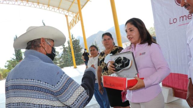 Acompañada del presidente municipal, Rodolfo Cisneros Gallegos, hizo entrega de apoyos alimentarios, calzado, utensilios de cocina y bolos, con la finalidad de mejorar las condiciones de las familias.