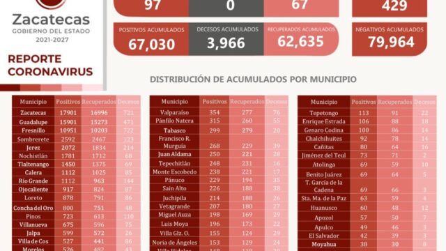Este día, Zacatecas alcanzó los 67 mil 030 positivos confirmados al virus SARS-CoV-2.