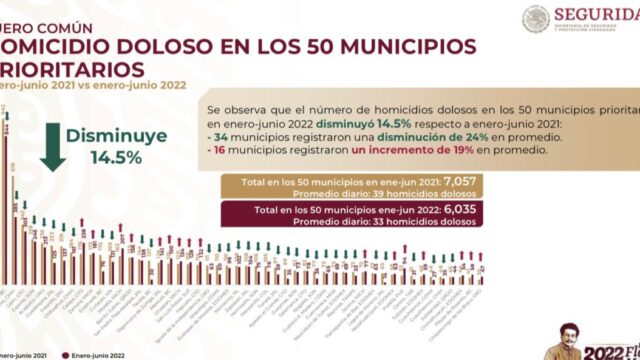 Asimismo, se observa que el número de homicidios dolosos en los 50 municipios prioritarios en el periodo enero-junio 2022 disminuyó 14.5 por ciento con respecto a enero-junio 2021.