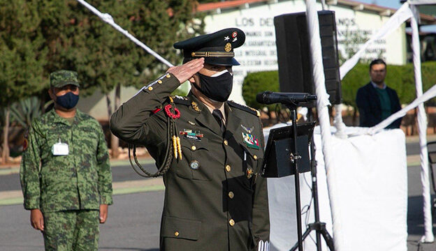 Junto a los integrantes de la Mesa Estatal de Construcción de Paz, el mandatario presenció el acto de toma de protesta de bandera del General de Brigada de Estado Mayor, a cargo del Comandante de la V Región Militar, Maximiliano Cruz, acto que simbolizó el compromiso, la independencia, el honor y el respeto a las instituciones del territorio nacional.