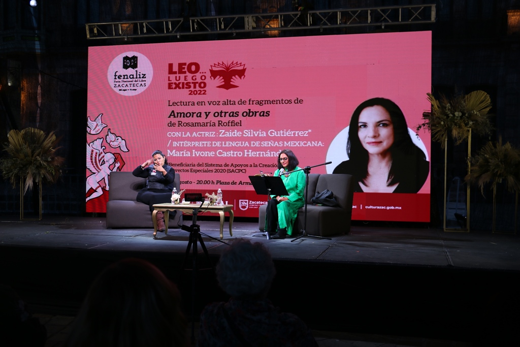 Finalmente, en el foro de Plaza de Armas, se integró, dentro de las actividades de la Feria Nacional del Libro Zacatecas 2022 el programa de Leo…luego existo, con la intervención de la actriz mexicana Zaide Silvia Gutiérrez, quien realizó la lectura en voz alta del libro Amora y otras obras, de la escritora y periodista mexicana, Rosamaría Roffiel.