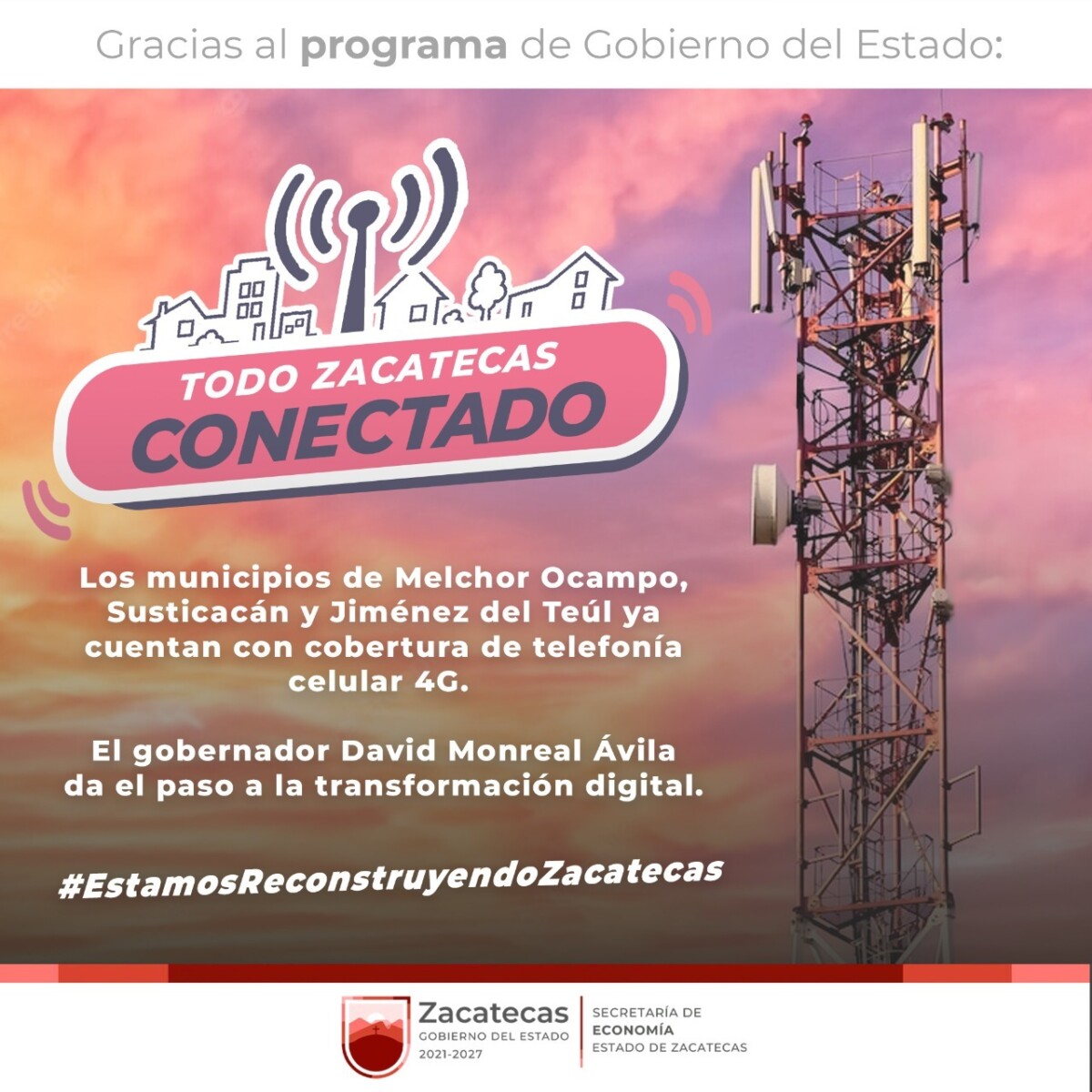 Gracias a las gestiones realizadas por el Gobernador David Monreal con el Gobierno de México, ya se han instalado tres nuevas torres de telecomunicaciones de cobertura total 4G, en los municipios de Susticacán, Melchor Ocampo y Jiménez del Teul, para dotarlos de telefonía celular 4G y red de internet.