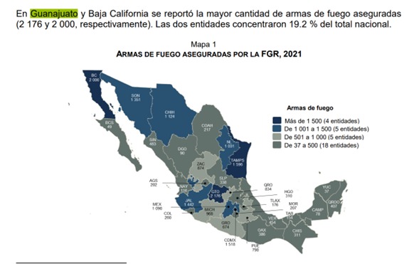 Guanajuato y Baja California son los dos estados que concentran la mayor cantidad de armas aseguradas; con 2 mil 176 y 2 mil respectivamente.