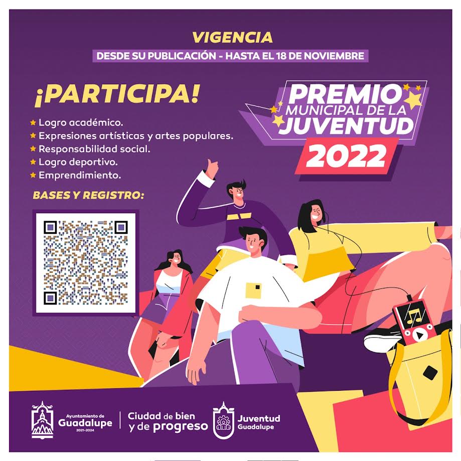 Zacatecas, Zac.- Con el objetivo de reconocer la participación de las y los jóvenes en la construcción de un municipio de paz y bienestar, el Ayuntamiento de Guadalupe que encabeza el alcalde, Julio César Chávez Padilla, a través de la Dirección Municipal de la Juventud, dio a conocer la convocatoria correspondiente al Premio Juvenil 2022.