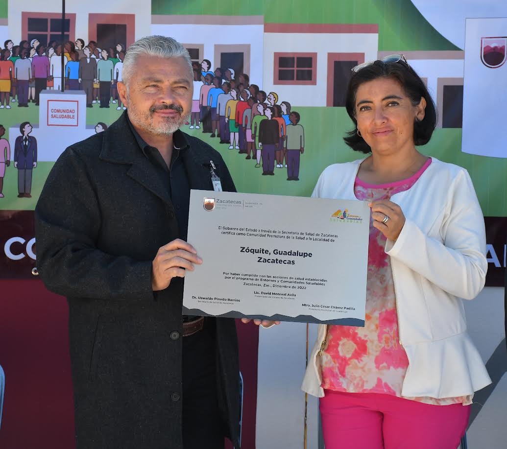 Finalmente se informó que la Comunidad de Zóquite y el municipio de Guadalupe, Zacatecas, son pioneros en el proyecto de Comunidades Saludables Certificada en el Estado de Zacatecas, lo que implica un compromiso irrestricto de ayudar a las familias a generar las destrezas necesarias para abordar los problemas comunitarios y de salud, proveyéndoles de educación e información en escuelas, hogares y demás escenarios comunitarios.