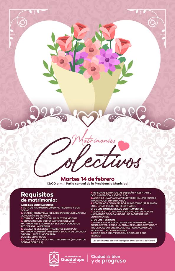 Será este próximo martes 14 de febrero en las instalaciones de la Presidencia Municipal de Guadalupe, donde se llevarán a cabo las bodas en punto del medio día.