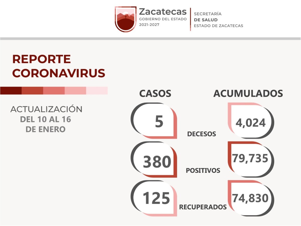 Zacatecas, Zac- La Secretaría de Salud de Zacatecas (SSZ) informó que, del 10 al 16 de enero de 2023, contabilizó 380 nuevos casos de COVID-19, a 125 personas recuperadas y cinco decesos por complicaciones causadas por el virus.