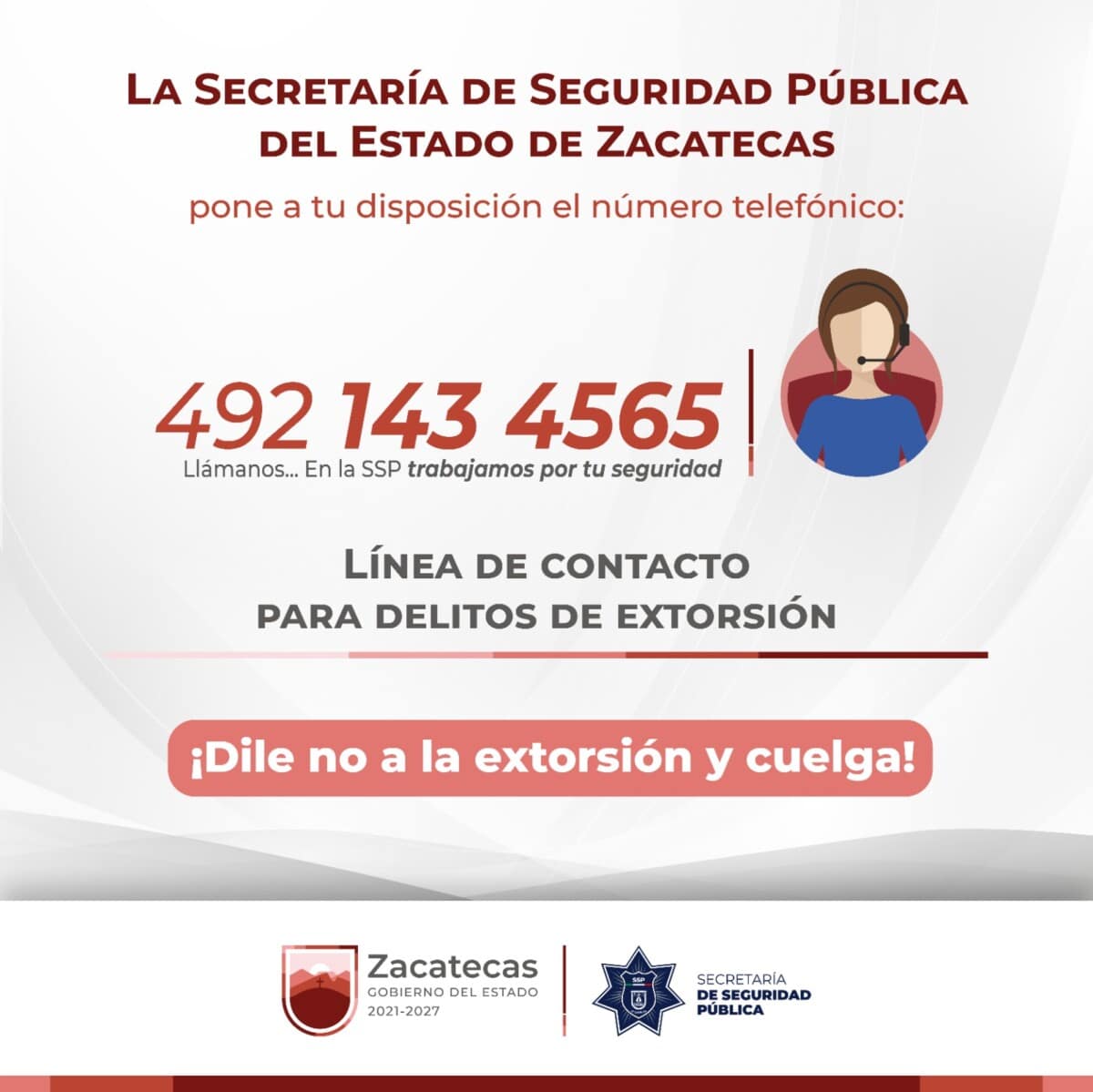 Zacatecas, Zac- Con el objetivo de proporcionar las herramientas y mecanismos de atención inmediata a víctimas del delito, la Secretaría de Seguridad Pública del Estado de Zacatecas pone a disposición de las y los zacatecanos una línea telefónica a través de la cual se atenderá el delito de extorsión.