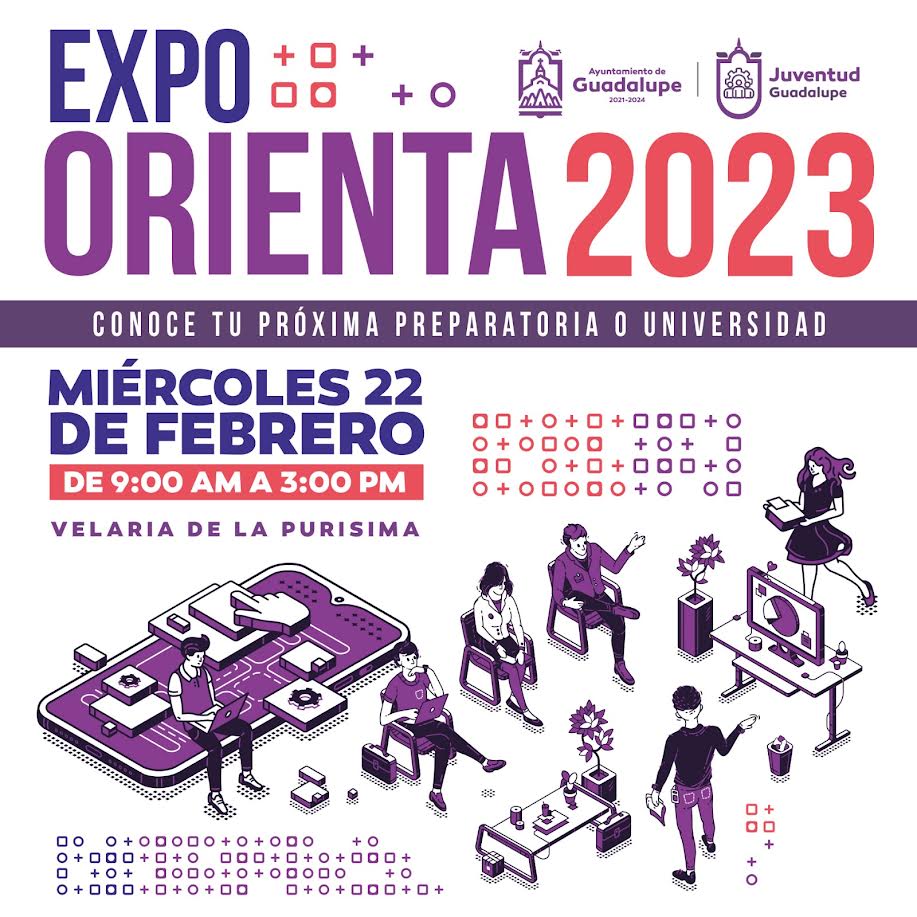 Zacatecas, Zac.- Con el objetivo de apoyar en las acciones de orientación vocacional, el Ayuntamiento de Guadalupe que encabeza el Presidente Municipal Julio César Chávez Padilla, a través de la Dirección Municipal de la Juventud, invita a la Expo Orienta 2023 bajo el lema “Conoce tu próxima Universidad o Preparatoria”.