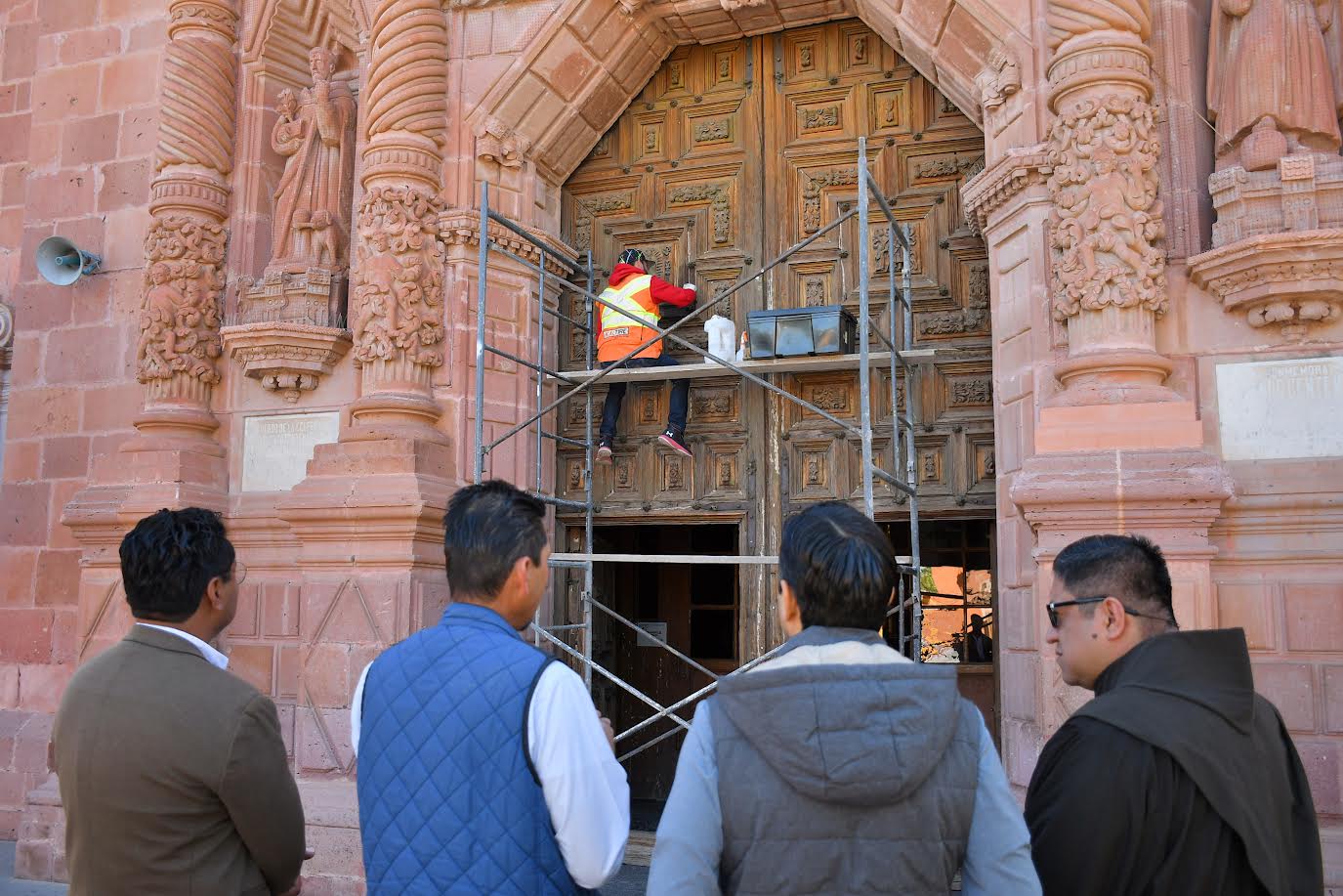 Zacatecas, Zac.- El Alcalde de Guadalupe, Julio César Chávez Padilla, realizó una supervisión de obra correspondiente a la rehabilitación de la puerta del Convento de Guadalupe ubicado en el Jardín Juárez.