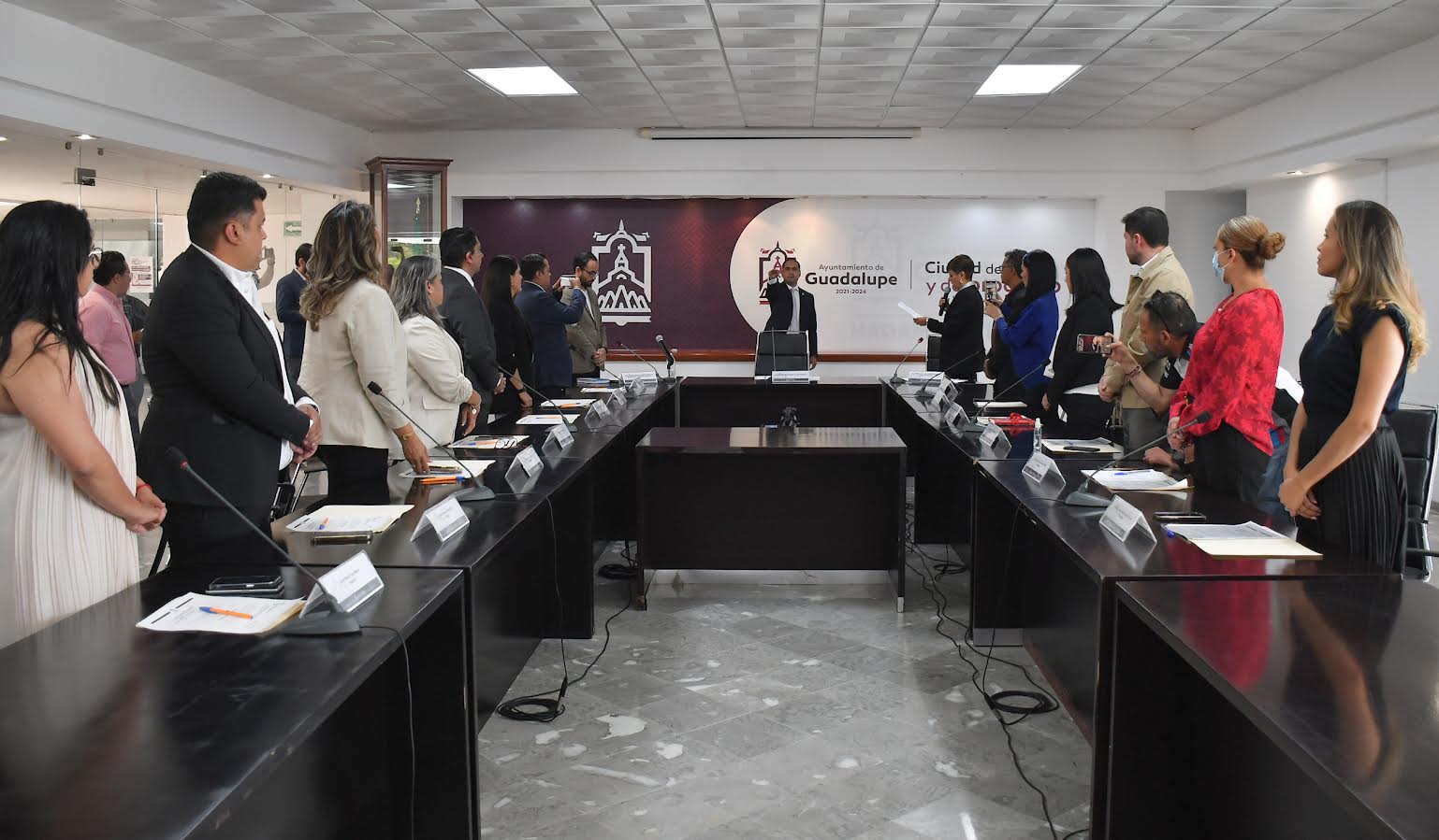 Fue para las 3 de la tarde de este sábado 22 de abril, que se convocó al cuerpo edilicio para que la Síndico Municipal, María de la Luz Muñoz Morales, le tomara la protesta de ley a Saldívar Alcalde, para luego expresar que “Guadalupe está de pie, Guadalupe sigue adelante y en Guadalupe existe la gobernabilidad”.