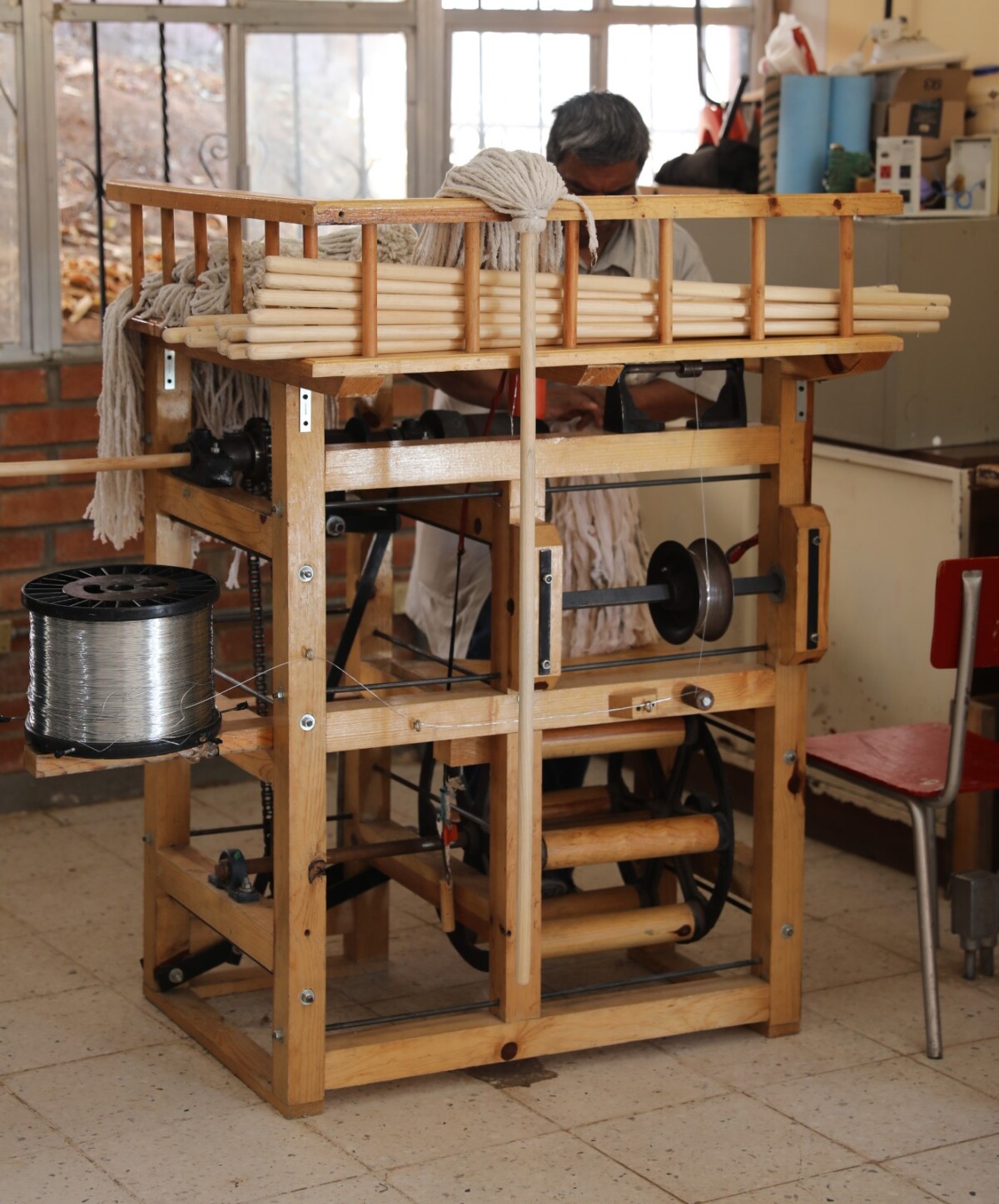 Los jóvenes comienzan lijando las partes ásperas de un palo delgado y alargado, peinan el pabilo y el hilo suave, que son básicamente los materiales que utilizan para elaborar un trapeador.