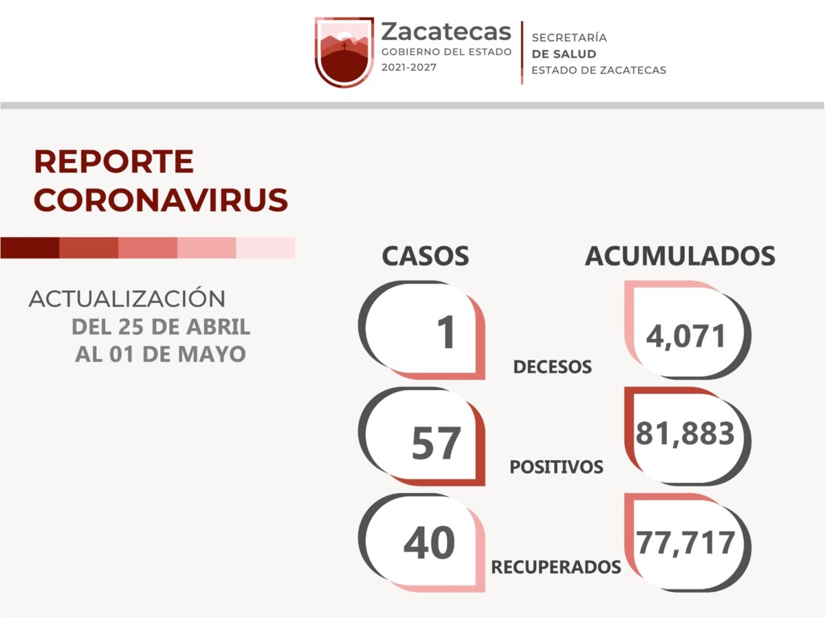 Zacatecas, Zac.- Del 25 de abril al 02 de mayo, la Secretaría de Salud de Zacatecas (SSZ) reportó que hubo 57 nuevos casos positivos de COVID-19, 40 zacatecanos recuperados y un deceso relacionado con el coronavirus.