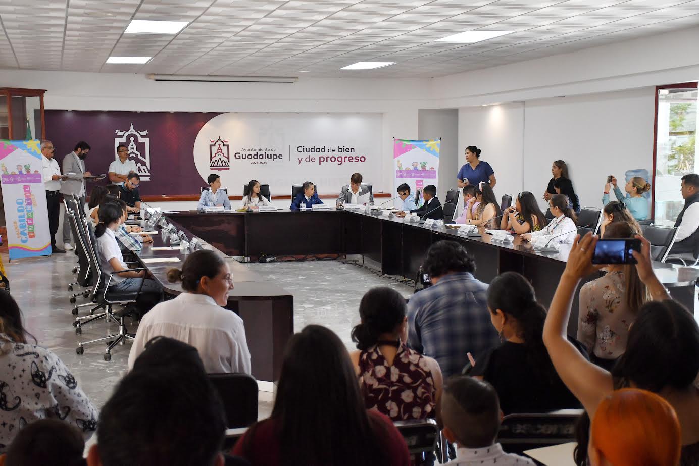 Fue este martes cuando se realizó el nombramiento a los integrantes del Primer Cabildo Infantil del Ayuntamiento de Guadalupe, conformado por Sofía Cristina Martínez Reyes como Presidenta Municipal, Jaziel Armando Salazar García como Secretario de Gobierno y Owen Matteo Carmona Acosta, designado como Síndico.