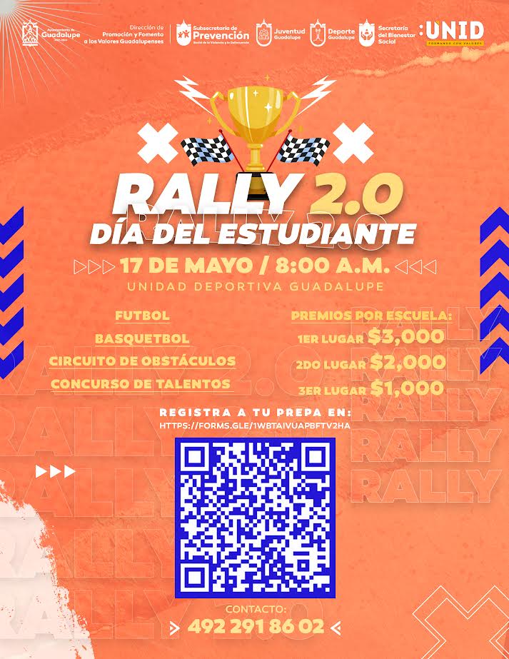 El ‘Rally 2.0’ se organiza -de manera coordinada- a través de la Secretaría del Bienestar Social, de la Subsecretaría de Prevención Social de la Violencia y la Delincuencia y de las Direcciones de Promoción y Fomento a los Valores Guadalupenses, de Juventud y del Deporte.