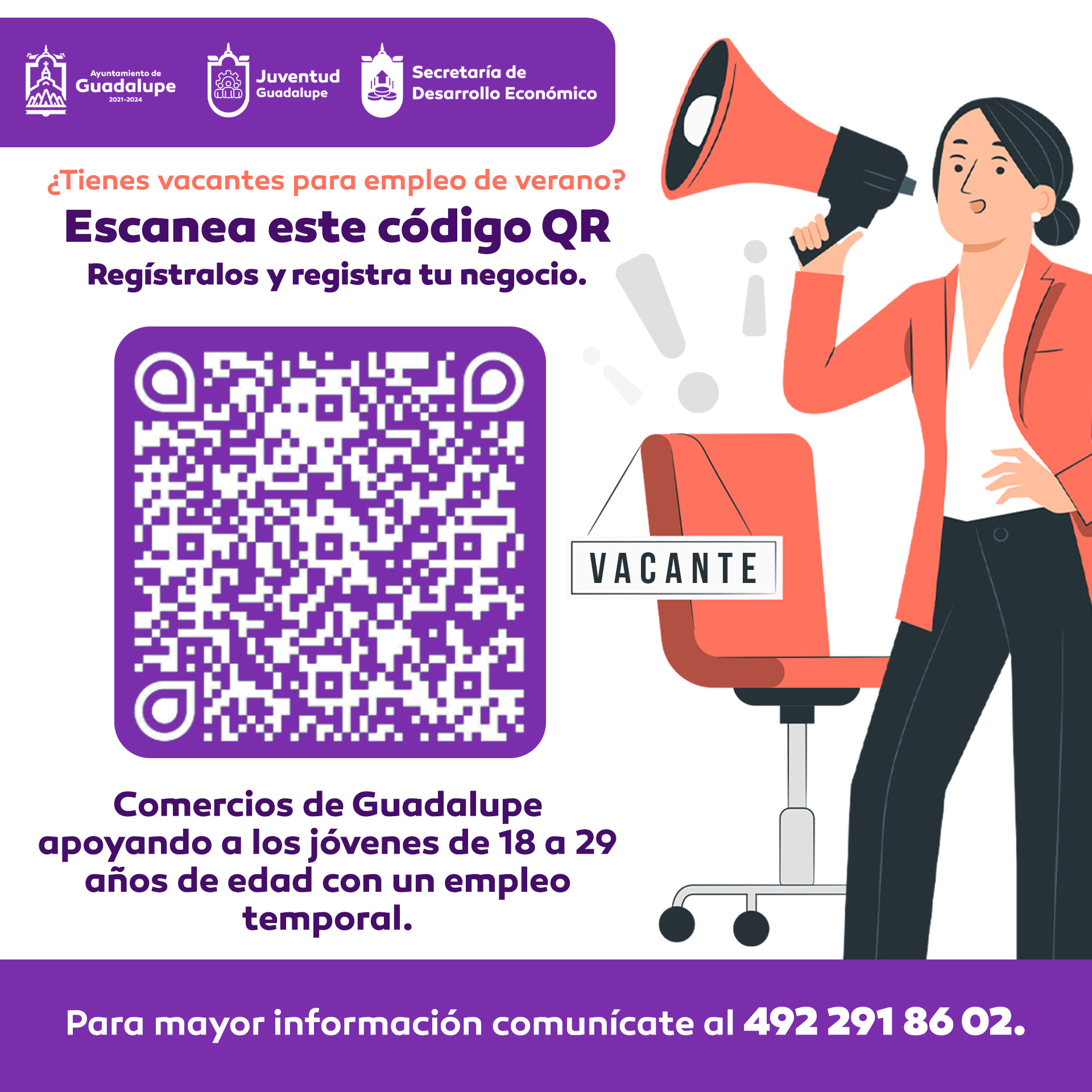 Las empresas, comercios o establecimientos interesados, deberán de mandar la información detallada de las vacantes al teléfono 492 291 86 02, y una vez efectuada esta acción estar en posibilidades de difundir la información correspondiente entre los jóvenes interesados en ocupar alguna plaza laboral.