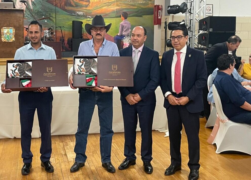 Durante la gala que reunió a las y los integrantes de los 21 clubes de zacatecanos, originarios de Atolinga, Valparaíso, Sombrerete, Monte Escobedo, Fresnillo, Tepetongo, Ojocaliente, Villa González Ortega, Joaquín Amaro, Gral. Francisco R. Murguía, Gral, Pánfilo Natera, Jerez y Villanueva, se abanderó y tomó protesta a dos nuevos clubes: La Gavia de Jerez y Comunitario Boca de Villanueva.