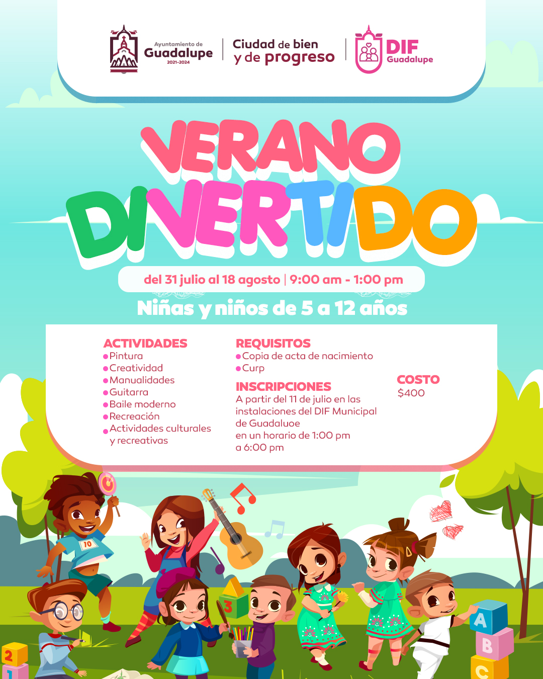 Zacatecas, Zac.- El Ayuntamiento de Guadalupe a través del Sistema Municipal DIF Guadalupe, invita al Curso denominado ‘Verano Divertido’, el cual está orientado a niñas y niños del Municipio de Guadalupe.