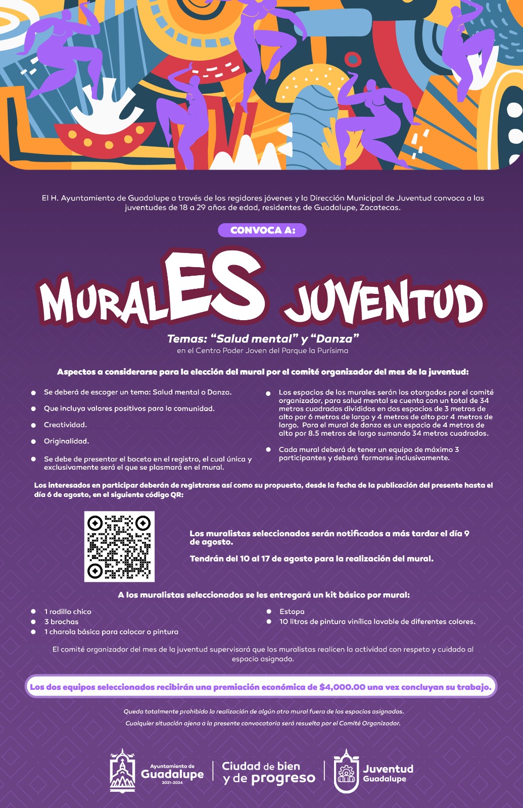 Se trata de un proyecto que se organiza en el marco del mes de la juventud en el cual se convoca al talento guadalupense a realizar un mural relacionado con los temas de salud mental y danza, que incluya valores positivos para la comunidad, creatividad y originalidad.