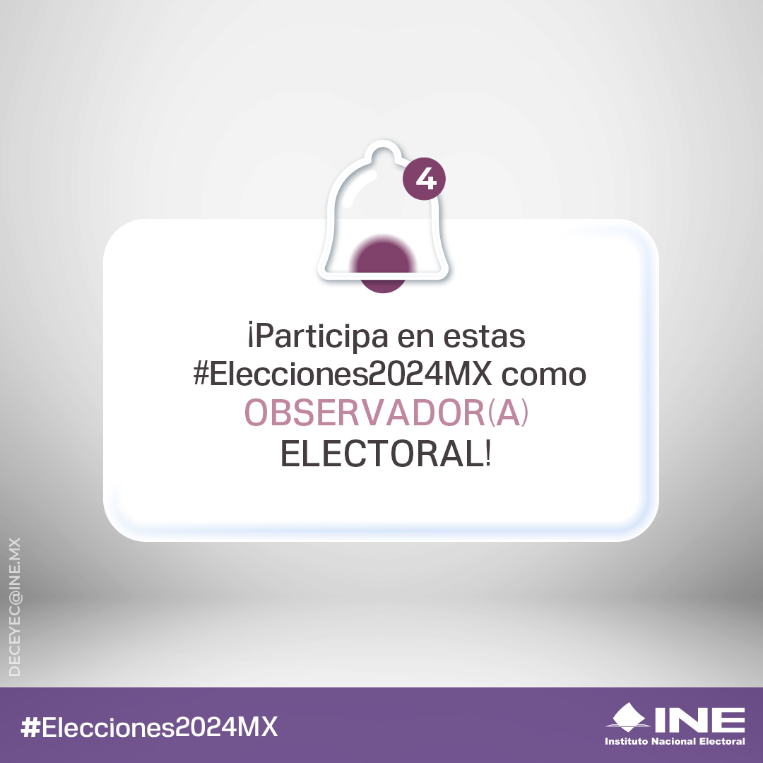 Zacatecas, Zac.- Con la finalidad de incentivar la participación ciudadana en la vida democrática de nuestro país, el Instituto Nacional Electoral emite la convocatoria pública para fungir como observadora u observador electoral durante el Proceso Electoral que tendrá elecciones concurrentes, federal y local, el 2 de junio de 2024 y en el que se renovarán más de 20 mil cargos a nivel federal y local, entre los que se encuentran: Presidencia de la República, Senadurías, Diputaciones federales, una Jefatura de Gobierno, Gubernaturas en ocho estados y Diputaciones locales en 31 entidades, además, Ayuntamientos y Alcaldías en 30 estados.