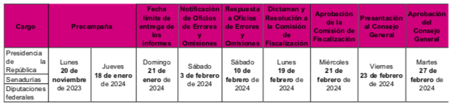 Como resultado de este ajuste en las fechas de inicio y término de las precampañas, el pleno también determinó una reducción de plazos en materia de fiscalización, para quedar en los siguientes términos: