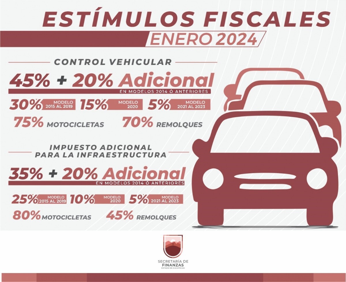 Para el mes de enero, se han contemplado estímulos fiscales de hasta el 35%, con un 20% adicional para modelos 2014 y anteriores, 25% para modelos 2015 al 2019, 10% para modelos 2020 y 5% para modelos 2021 al 2023. Además, se aplicarán estímulos del 80% para motocicletas y 45% para remolques.