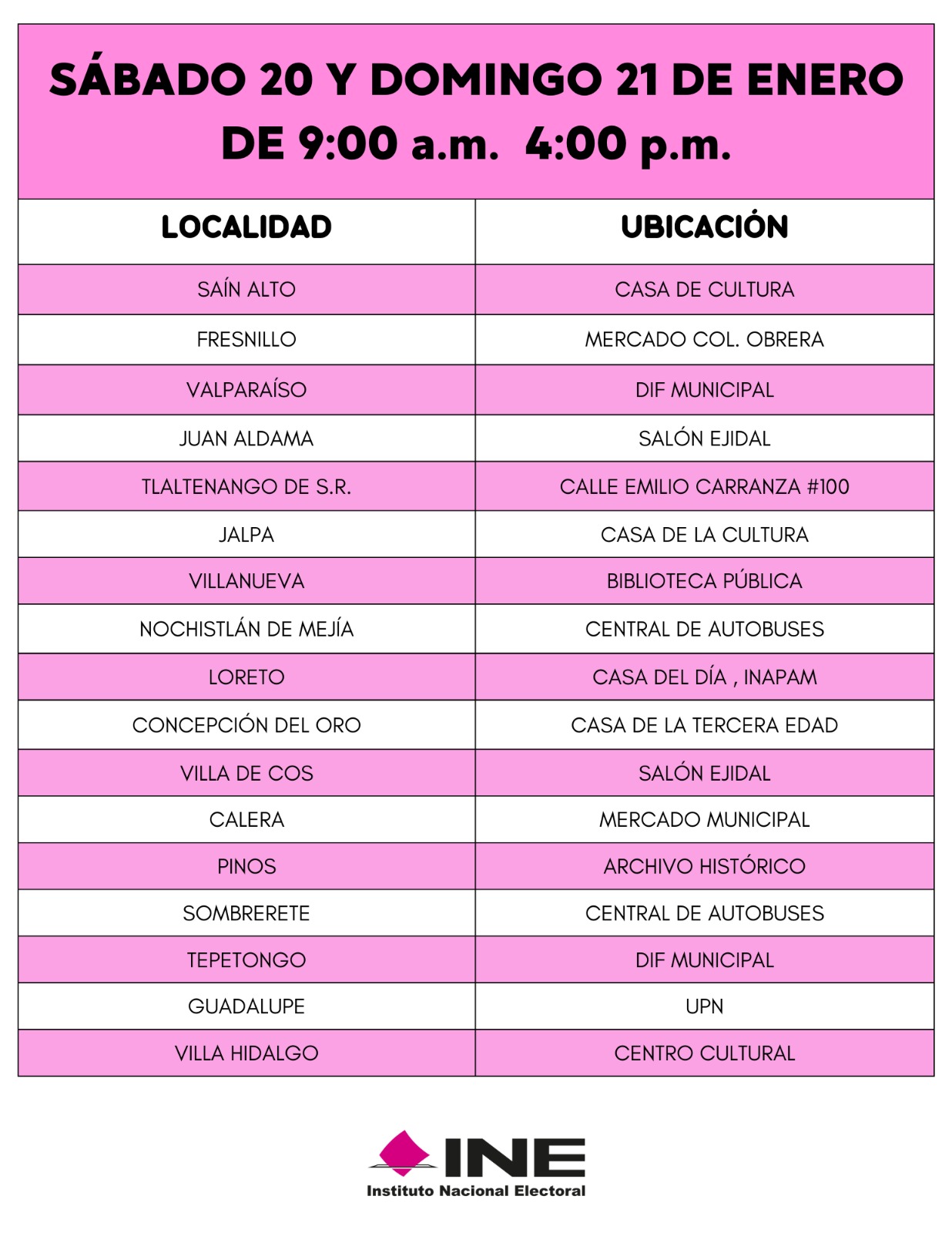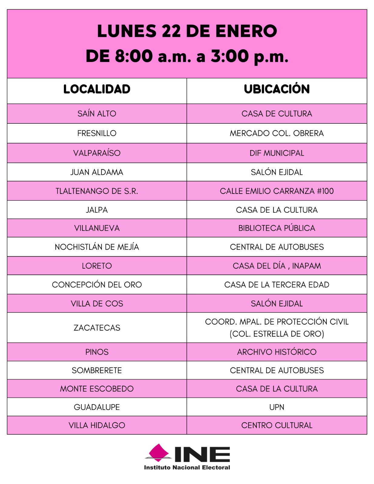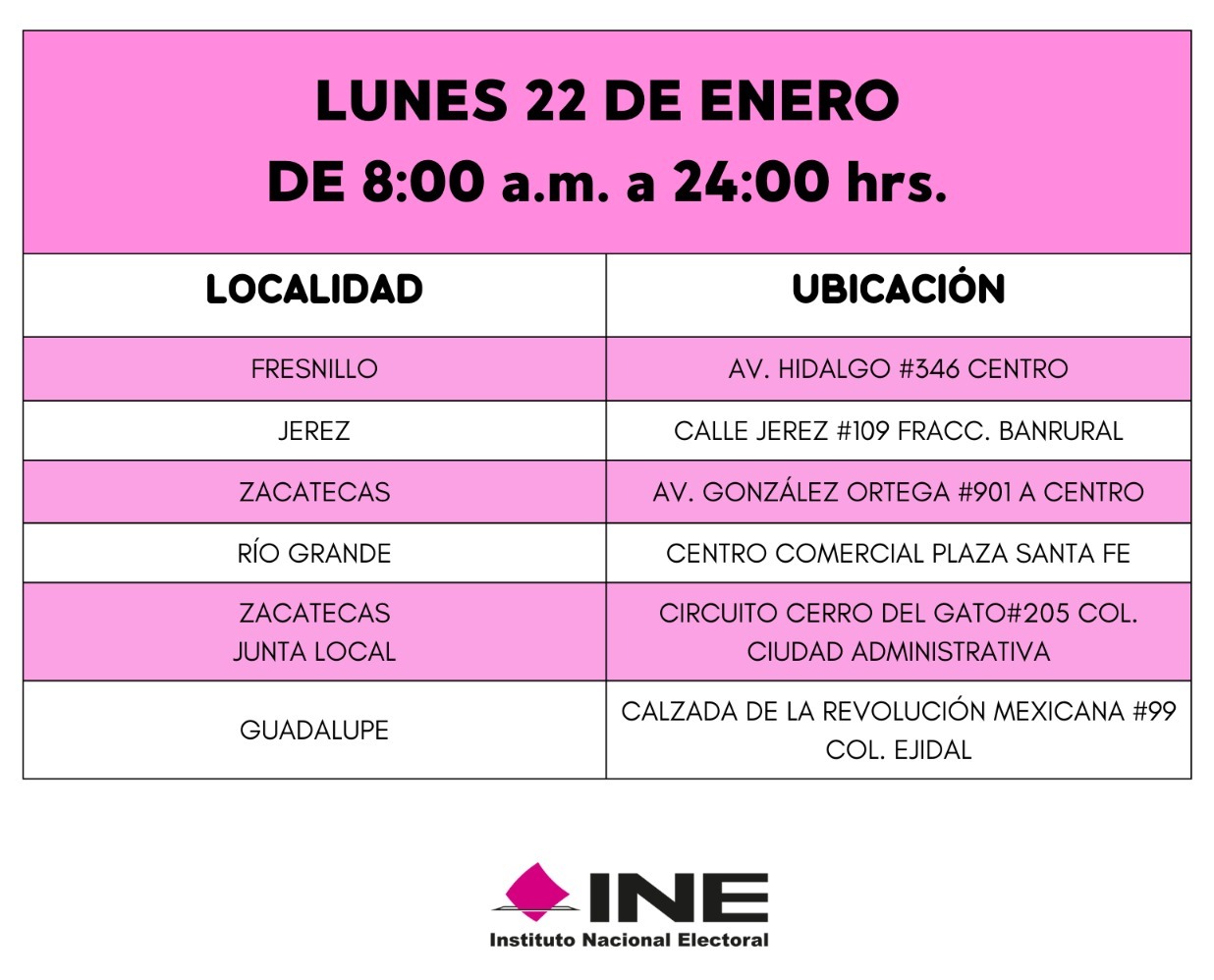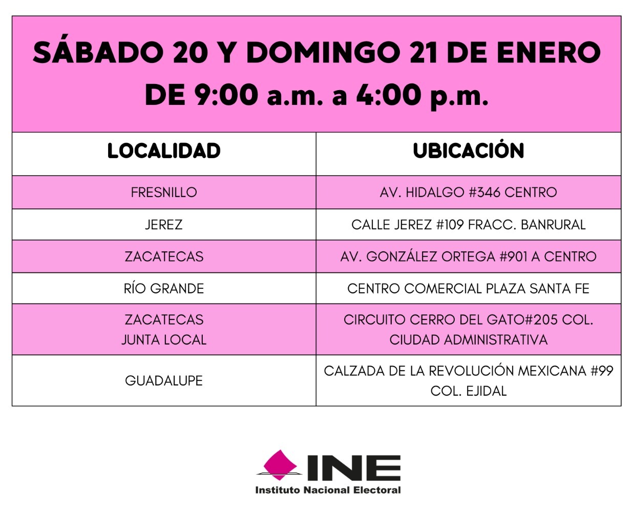 También puede consultar las páginas https://ubicatumodulo.ine.mx/ y https://www.ine.mx/credencial/ además de las redes sociales Facebook INE Zacatecas y X (Twitter) @IneZacatecas.