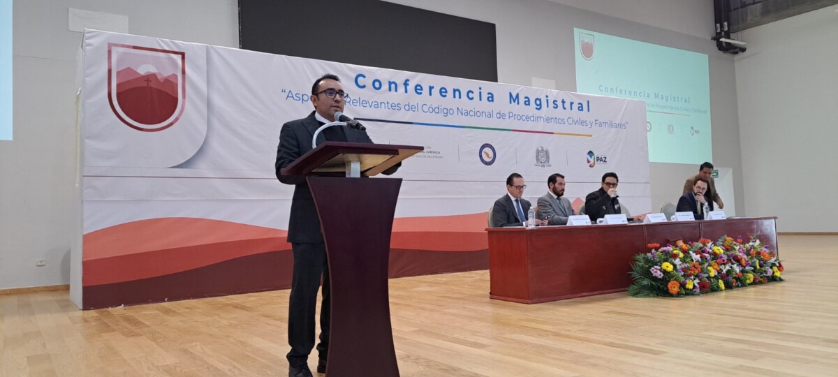 Zacatecas, Zac.- A fin de impulsar actividades que garanticen la justicia y permitan avanzar en la pacificación y construcción de una sociedad más justa y equitativa, el Gobierno de Zacatecas, encabezado por el mandatario estatal David Monreal Ávila, en conjunto con el Colegio Nacional del Notariado Mexicano y la Universidad Autónoma de Zacatecas (UAZ), ofrecieron al gremio jurista una Conferencia Magistral sobre el Código Nacional de Procedimientos Civiles y Familiares.