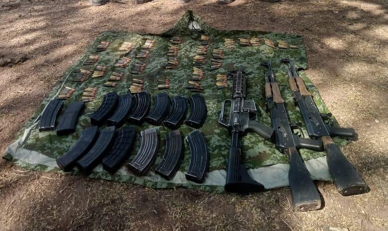 Al realizar una revisión de la zona, se aseguraron tres armas de fuego largas, seis cargadores, 170 cartuchos útiles y un chaleco táctico.
