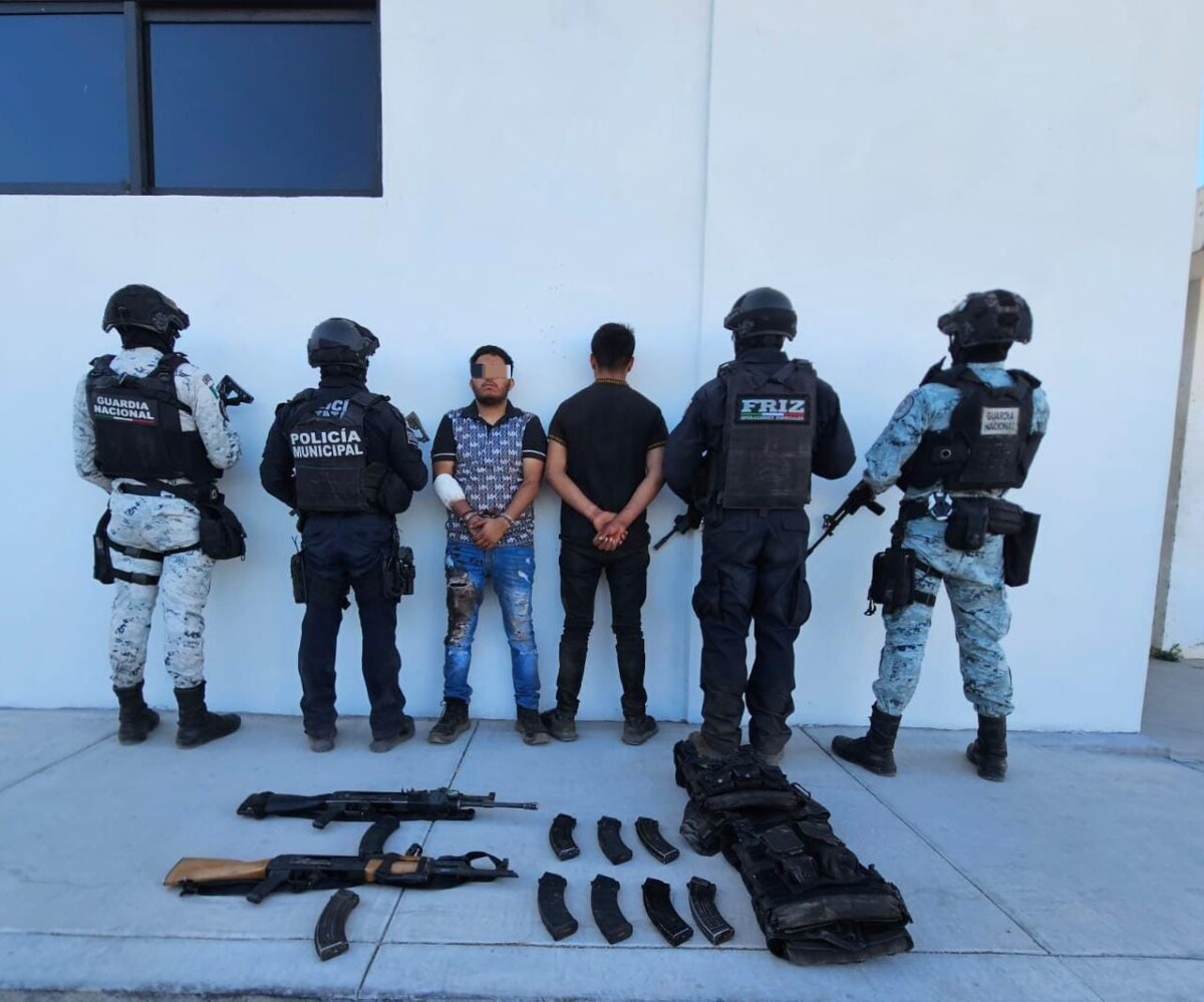 En una segunda acción, en la comunidad Colonia Plenitud, también en Fresnillo, efectivos de la FRIZ, Ejército Mexicano y Guardia Nacional detuvieron a Juan N., de 19 años y Felipe N., de 27 años, ambos originarios de Durango.