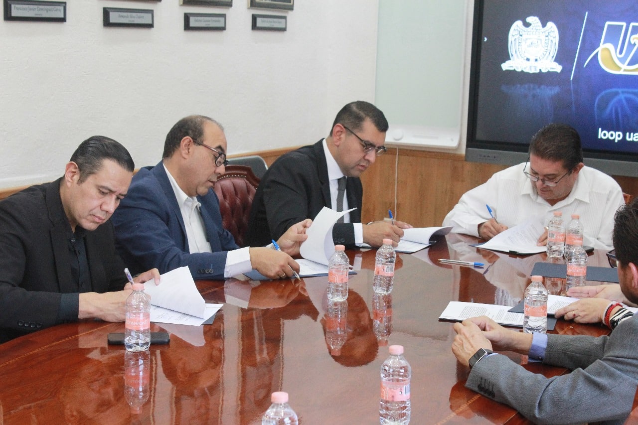 Zacatecas, Zac..- Con la finalidad de establecer las bases generales de colaboración entre la Universidad Autónoma de Zacatecas (UAZ) y la Fiscalía General de Justicia del Estado de Zacatecas (FGJE), autoridades universitarias y gubernamentales realizaron una firma de convenio entre ambas instituciones.