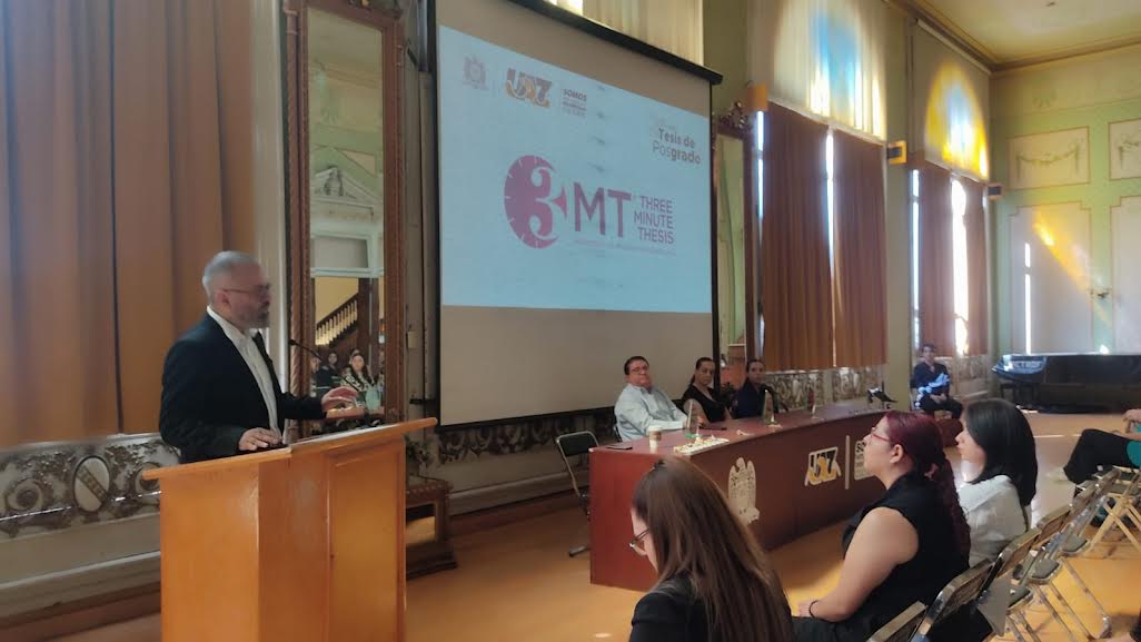 Zacatecas, Zac.-La Universidad Autónoma de Zacatecas (UAZ) a través de la Secretaría Académica de la llevó a cabo las Segundas Jornadas de Tesis de Posgrado en donde se realizó el Concurso Institucional Tesis en Tres Minutos (3MT) por sus siglas en inglés, en el que 17 estudiantes de posgrado pusieron a prueba su capacidad para explicar su investigación y el impacto que ésta tiene en menos de 180 segundos, utilizando un lenguaje claro y entendible para todas las audiencias y como apoyo visual una diapositiva fija.