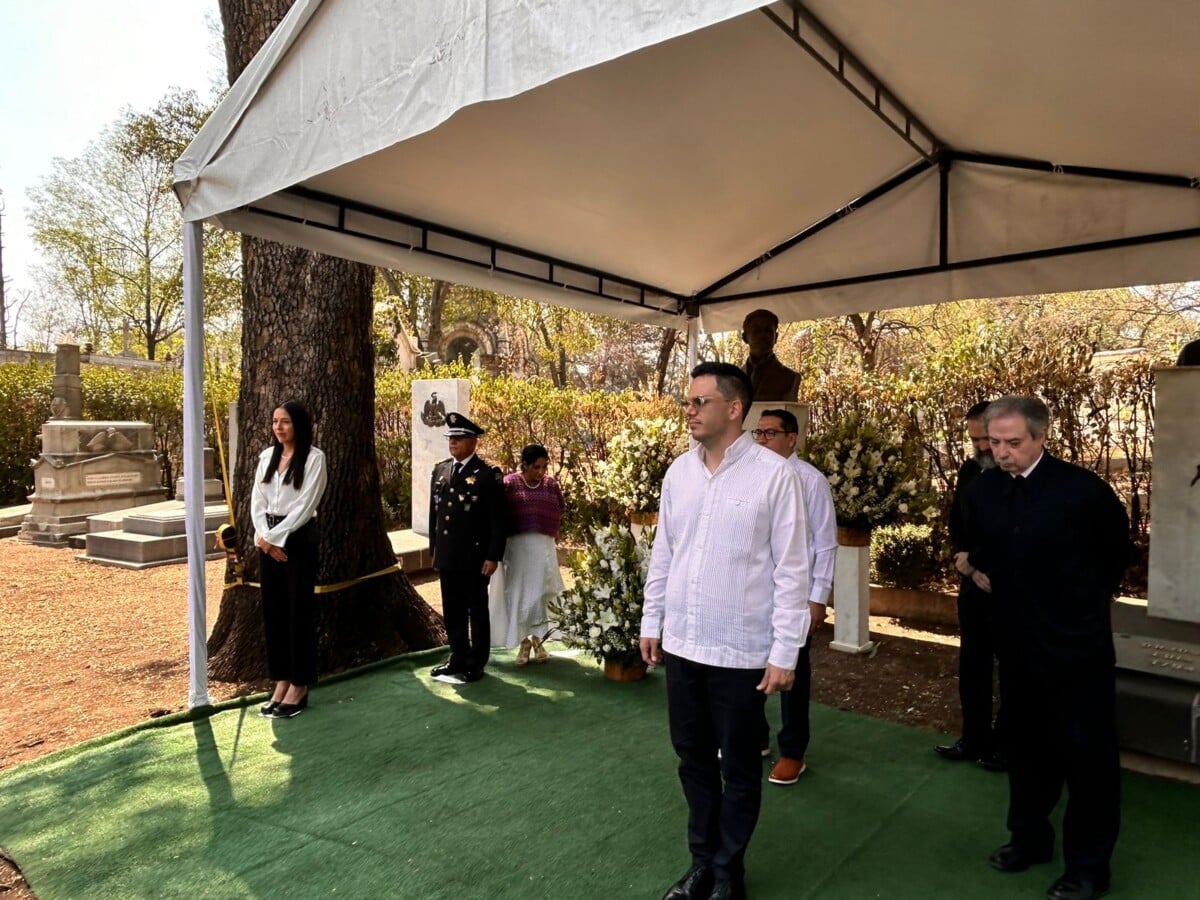 Ciudad de México.- En la Rotonda de las Personas Ilustres, del Panteón Civil de Dolores de la Ciudad de México, el Gobierno de Zacatecas, a través de sus autoridades, depositó una ofrenda floral en honor a Ramón López Velarde, uno de los poetas más icónicos de México, en el marco de las Jornadas Lopezvelardenas 2024.