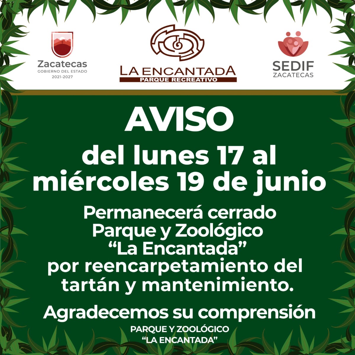 Zacatecas, Zac.- Debido a trabajos de rehabilitación, el Parque y Zoológico La Encantada permanecerá cerrado del lunes 17 al miércoles 19 de junio, toda vez que la prioridad para el Gobierno del Estado es brindar las condiciones de seguridad y de calidad a las y los usuarios.