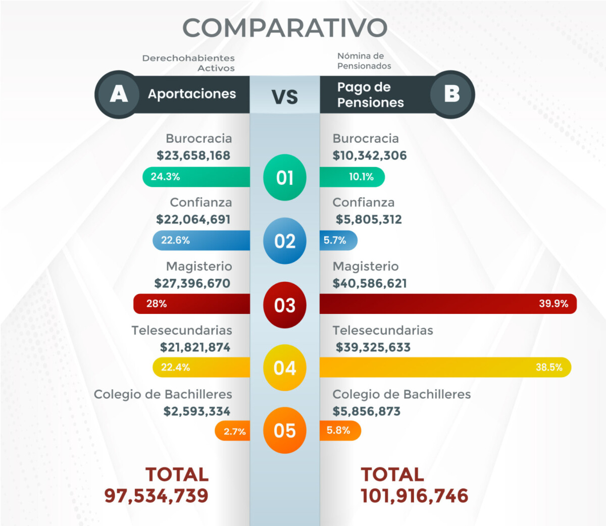 En el caso de la nómina de pensiones de 2 mil 033 pensionados que pertenecen al sector del Magisterio, se realiza un pago de 40 millones 586 mil 621 peso, de los cuales se recolectan de cuotas 8 millones 284 mil 214 pesos y en aportaciones del patrón se reúnen 19 millones 112 mil 456 pesos, que totalizan 27 millones 396 mil 670 pesos; ello arroja también un déficit en el pago de sus pensiones de 13 millones 189 mil 951 pesos, que también son completados con cuotas y aportaciones de otros cotizantes.