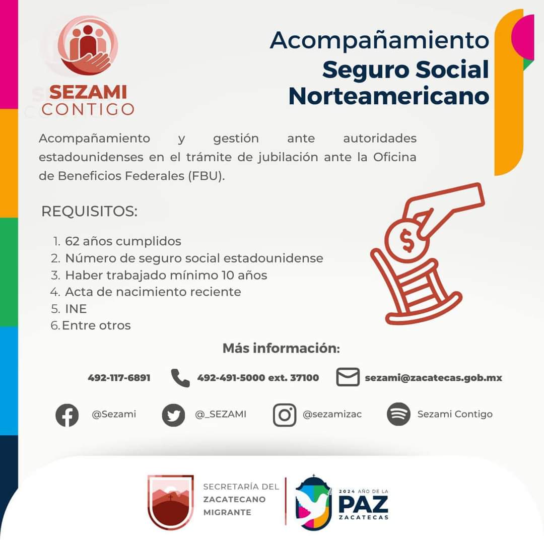 Zacatecas, Zac.- El Gobierno del Estado, a través de la Secretaría del Zacatecano Migrante (Sezami) y la Oficina de Beneficios Federales (FBU por sus siglas en inglés) del Consulado General de Estados Unidos en Guadalajara, convoca a las y los zacatecanos que laboraron en EE.UU. a la Cuarta Jornada de Entrevistas a una pensión del Seguro Social Norteamericano.