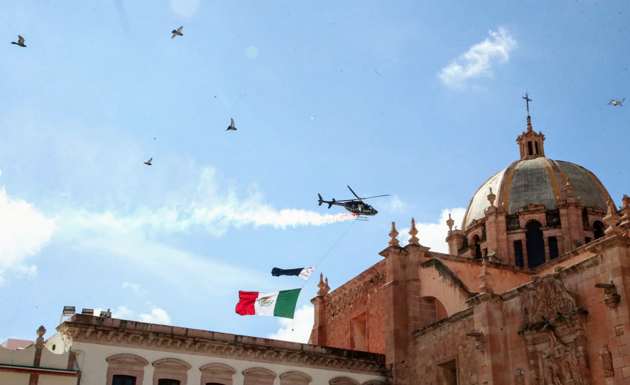 Las y los asistentes también observaron el helicóptero de la Policía Estatal Preventiva, que surcó el cielo a baja altura, portando una bandera de México ondeante, a la par de una bandera de la paz, mientras despedía humo de colores verde, blanco y rojo.