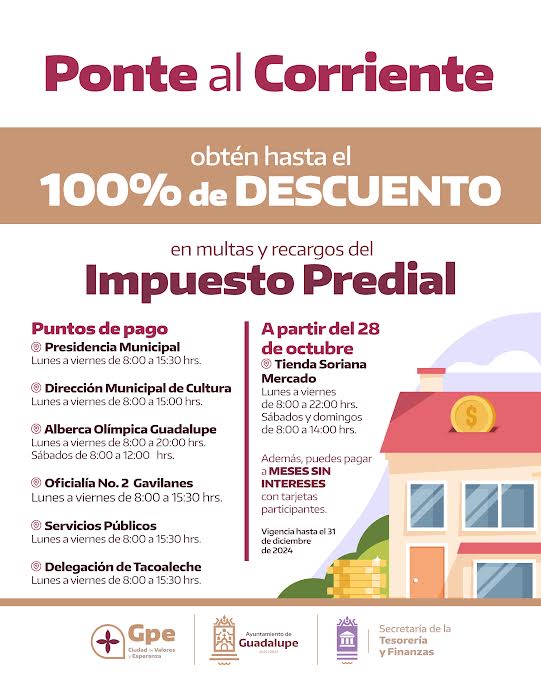 Es así que, en apoyo a los pobladores que tengan algún retraso en sus pagos del impuesto predial, el Ayuntamiento de Guadalupe dará un incentivo de hasta el 100% en multas y recargos.