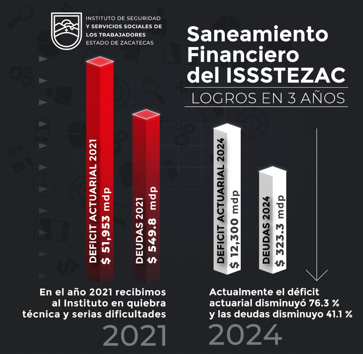 “El inicio de nuestra administración coincidió con el año más difícil para la historia del Instituto, al cual recibimos en quiebra técnica y con serias dificultades; actualmente, el déficit actuarial ha disminuido en un 76.3 por ciento y las deudas a corto plazo en un 41.1 por ciento; en el presente, el Issstezac se encuentra financieramente mejor que cuando lo recibí”, agregó el director general.
