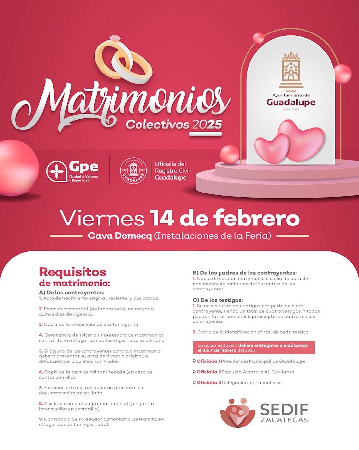 El evento se llevará a cabo en la Cava Domecq en las instalaciones de la feria el 14 de febrero de este año y la documentación requerida a contrayentes, padres y testigos se deberá entregar a más tardar el 7 de febrero en las oficialías del registro civil 1, 2 y 3 de la Presidencia Municipal de Guadalupe, Gavilanes y Tacoaleche; respectivamente.