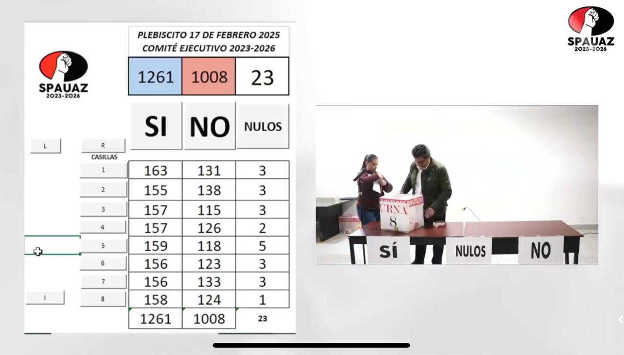 Jenny González Arenas, secretaria general del SPAUAZ señaló que la jornada de este lunes 17 de febrero fue histórica ya que se logró la participación de más del 79 por ciento de la base docente, cuya mayoría, es decir, 1 mil 261 votó a favor de la huelga en tanto que 1 mil 8 votaron en contra.