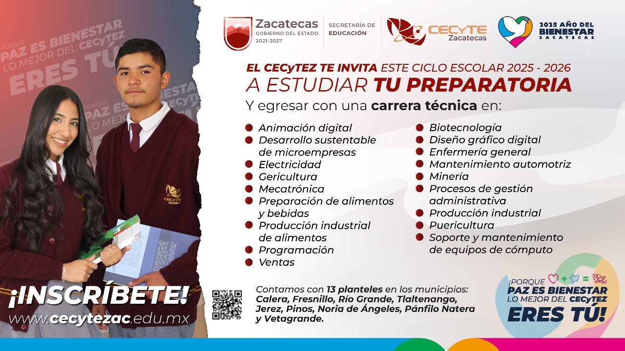 Zacatecas, Zac.- El Colegio de Estudios Científicos y Tecnológicos del Estado de Zacatecas (Cecytez) invita a las y los jóvenes que egresan de secundaria, a inscribirse al Ciclo Escolar 2025-2026 e ingresar a estudiar su preparatoria en la mejor opción de Educación Media Superior.