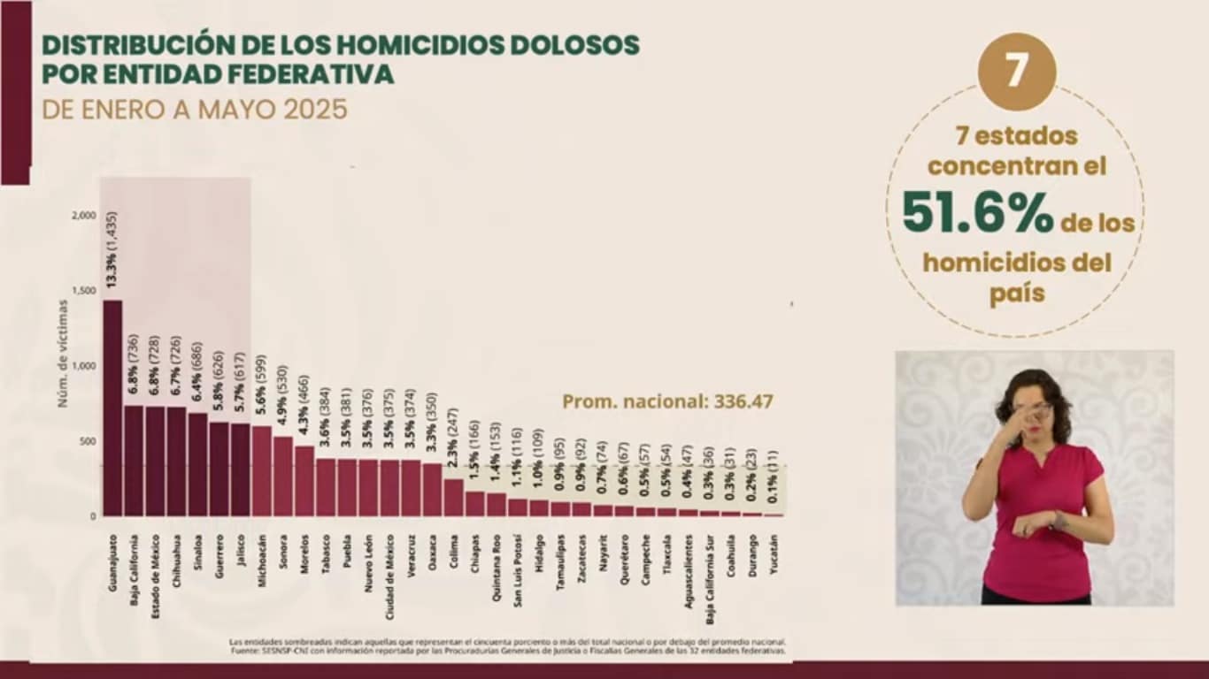 Estas siete entidades concentran el 51.6 por ciento de los homicidios registrados en el país durante el mismo periodo, con un promedio nacional de 336.47 víctimas.
