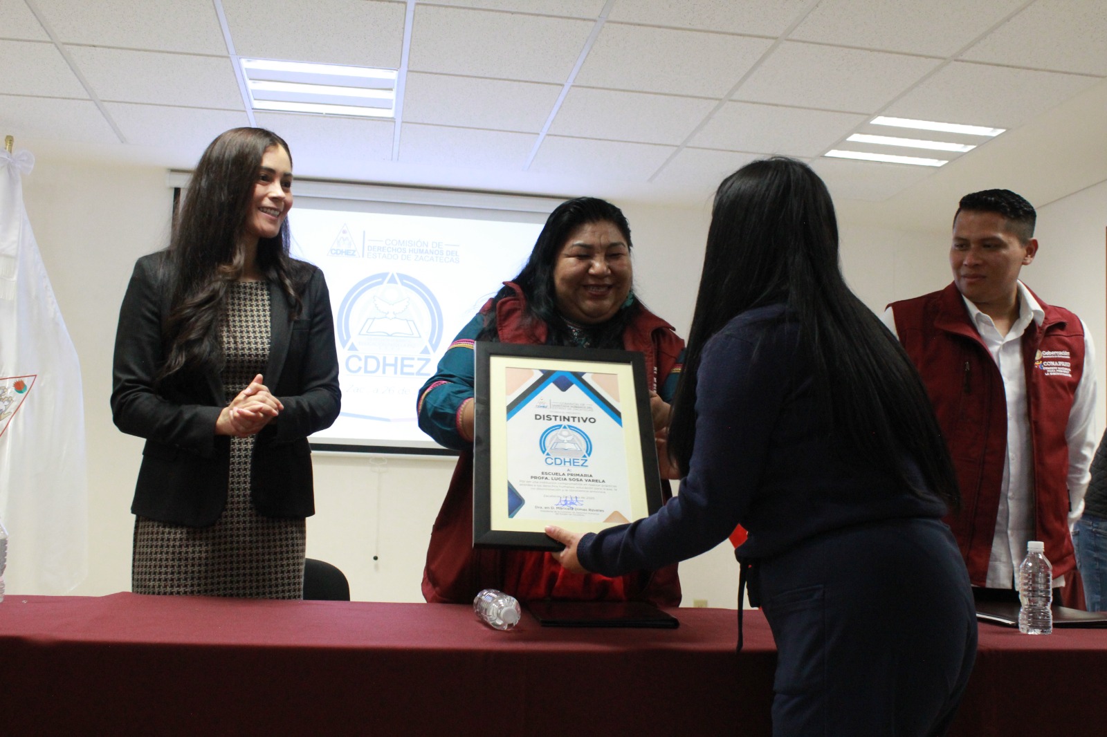 Asimismo, la Presidenta de la CDHEZ reconoció que cada institución premiada está sembrando el futuro, y que educar en derechos humanos es formar generaciones más libres, más conscientes y comprometidas con la justicia social, porque debe ser una práctica cotidiana que se construye en las aulas, los patios, los pasillos, en cada palabra y en cada gesto.