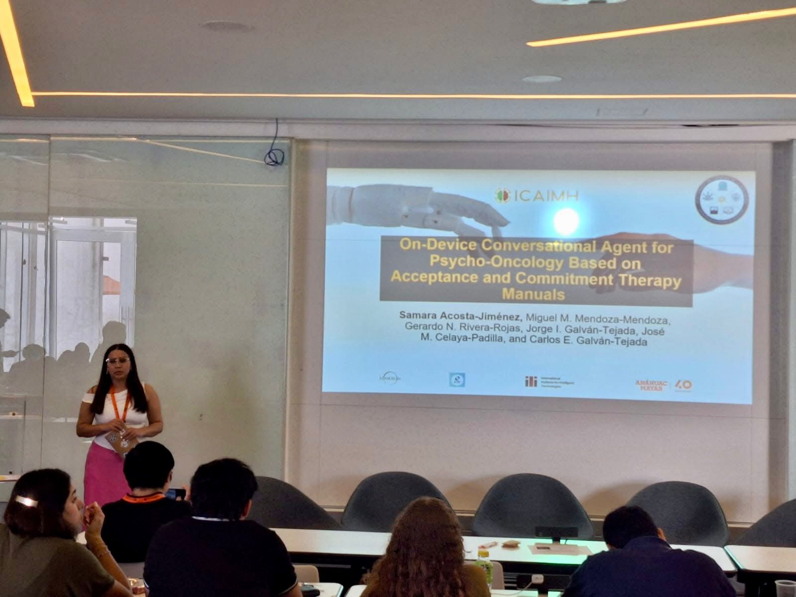 Durante esa importante Conferencia Internacional sobre Inteligencia Artificial para la Salud Mental, donde se reunió a especialistas de diversas disciplinas para dialogar sobre los avances, retos y oportunidades en el uso de la inteligencia artificial, así como para la comprensión, diagnóstico, intervención y acompañamiento en salud mental, Samara Acosta presentó la ponencia “Agente conversacional para psico-oncología basado en manuales de terapia de aceptación y compromiso”.