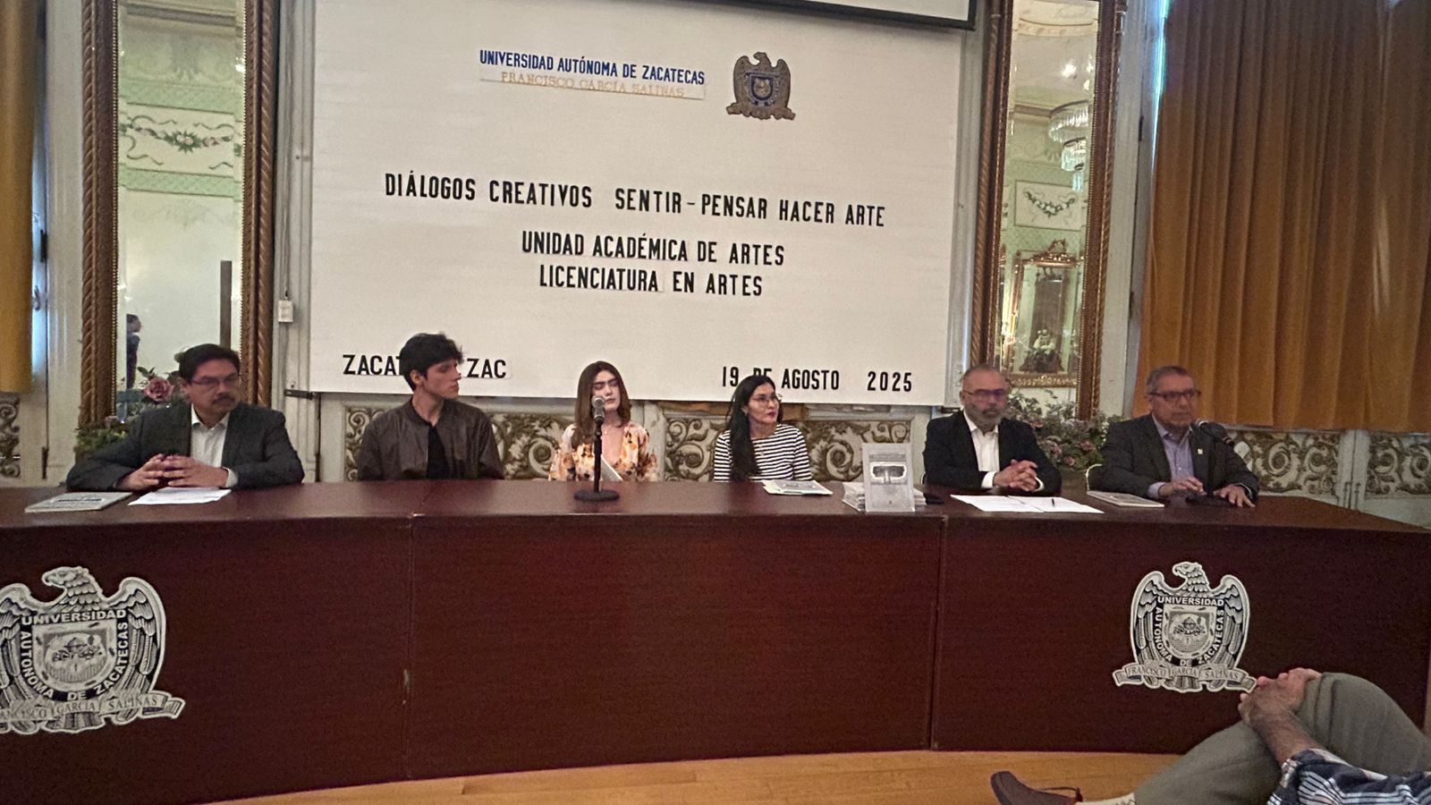 Zacatecas, Zac.- En un ambiente de reflexión y entusiasmo académico, la Universidad Autónoma de Zacatecas (UAZ), a través de la Unidad Académica de Artes (UAA), llevó a cabo la presentación del libro “Diálogos creativos: Sentir–Pensar–Nacer al arte”, editado por Taberna Libraria editores.