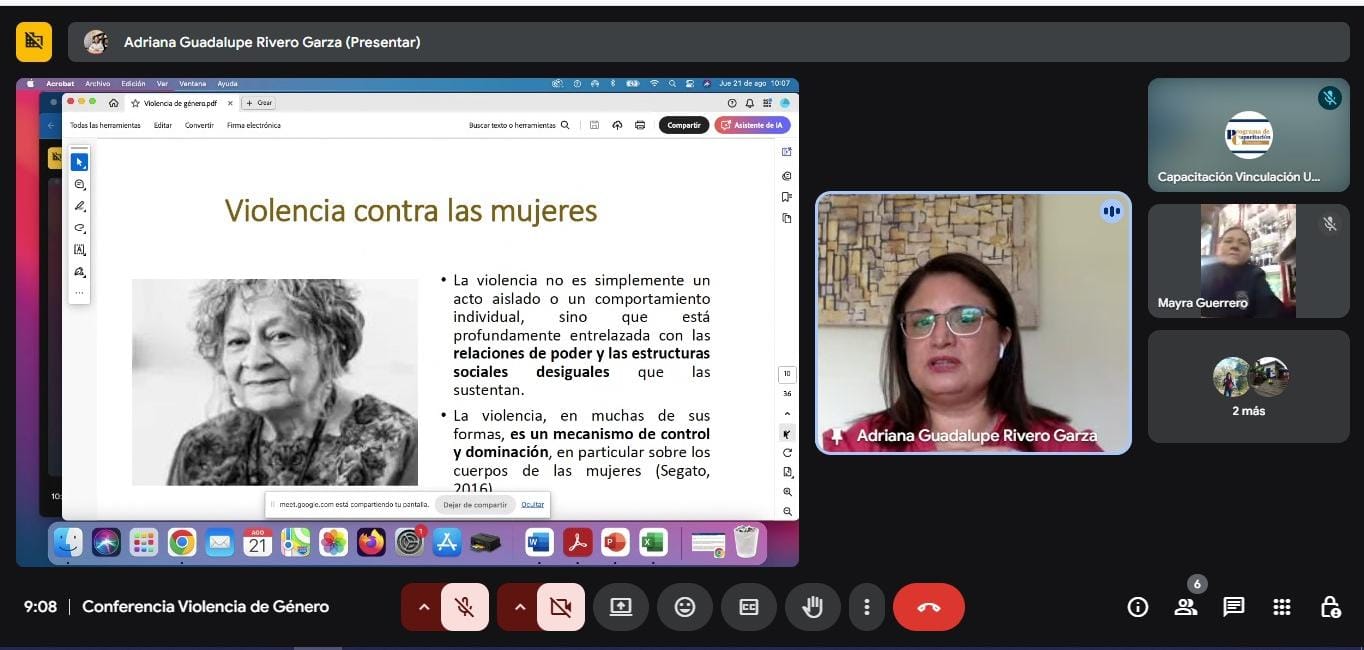 En su intervención, la docente Rivero Garza, comentó que la violencia de género se dirige principalmente contra las mujeres y las niñas, porque se origina en relaciones históricas y estructurales de desigualdad y discriminación entre hombres y mujeres; también -dijo-, se comete con las personas de la diversidad sexual y de género, sufren violencia por desafiar las normas del sistema sexo-género; y con hombres: en menor medida, también pueden sufrir violencia de género si no cumplen con la masculinidad hegemónica.